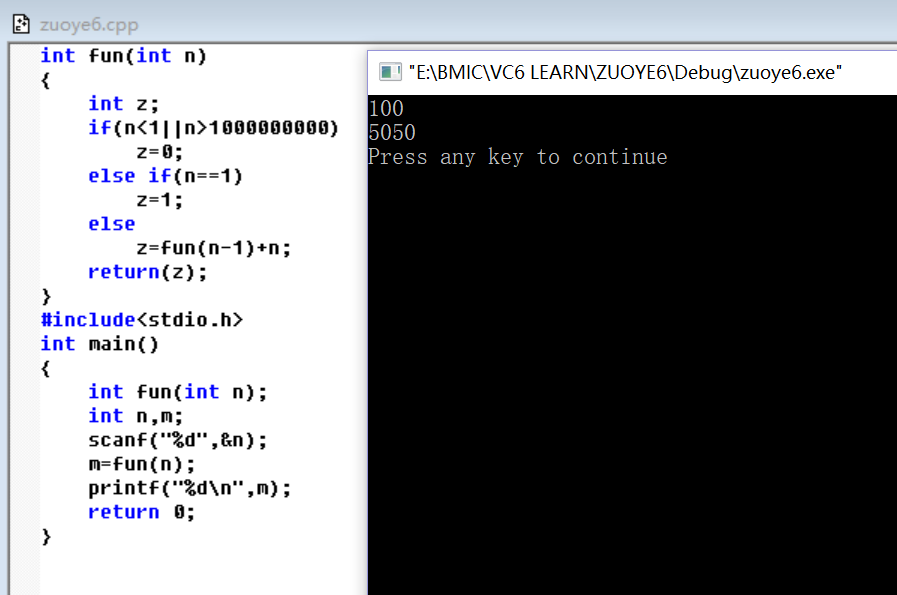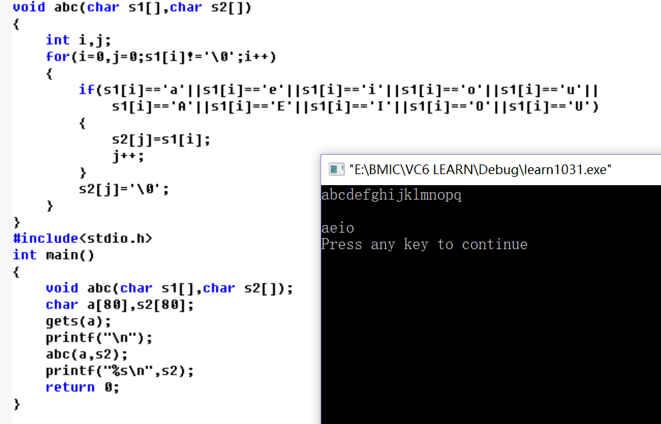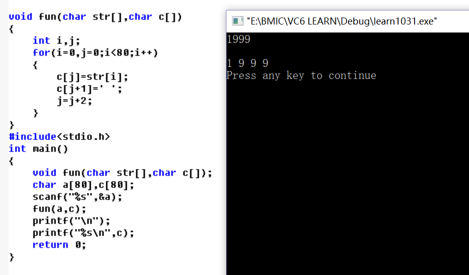 注意:函数中定义的是char类型,因此函数名的类型不能用int,用void类型,void没有返回值因此可以在主函数中和调用函数中使用同一个输出字符串数组直接输出。