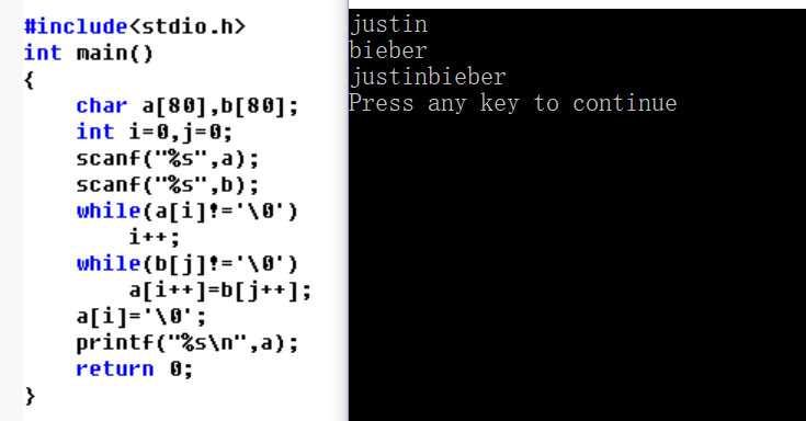 注意考虑到在第一个字符串碰到\0的情况时就开始连接第二个字符串,同样的第二个字符串连接完之后输出时要考虑到\0情况。