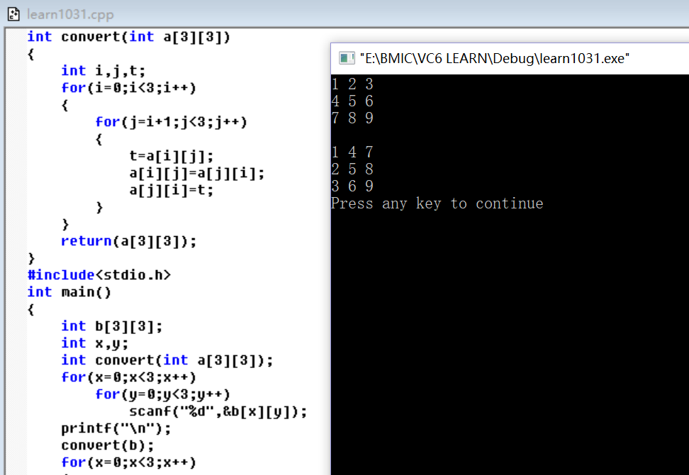 注意:函数中for循环读取到数组中的元素时应先取出赋值给t,不能直接进行转换。将第一个数组的i行j列赋给第二个数组的j行i列。