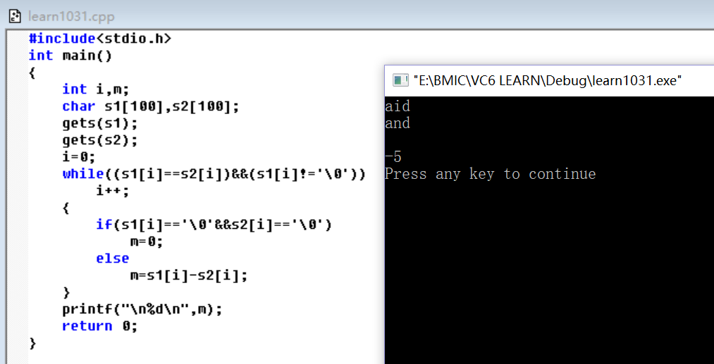 用gets输入两个字符串且不用strcpy函数比较两个字符串的大小并输出其ASCII差值: