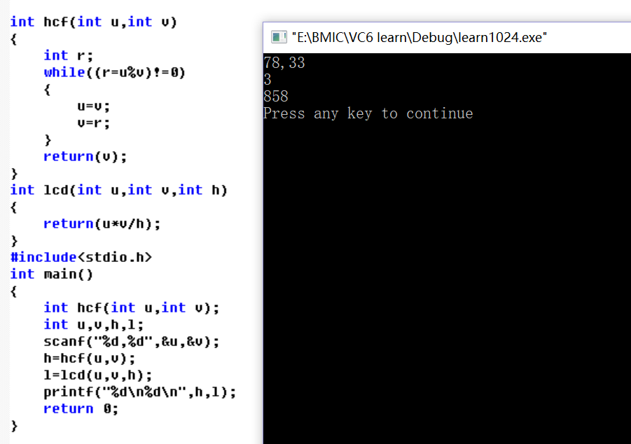 v=r; //将余数r赋值给v做下一步循环计算的被除数
