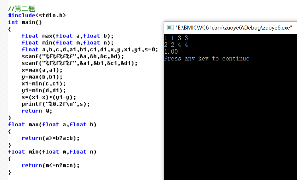 第二题只做出来了两个矩形在第一象限相交和重合时重叠的面积。思路大概是:两个矩形相交时所形成的小矩形将其左下角的坐标设为(x,y),右上角的坐标设为(x1,y2)。这两个点的坐标都可以用两个原矩形的坐标点来表示,表示出小矩形的坐标点之后再计算其重叠的面积。