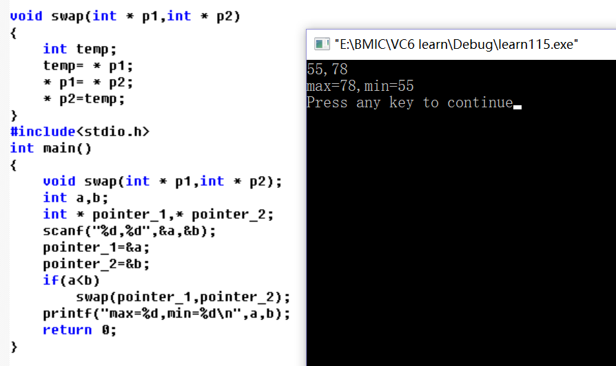 其中利用到指针,在max1中实现两个数对换。然后在max2中调用max1函数。