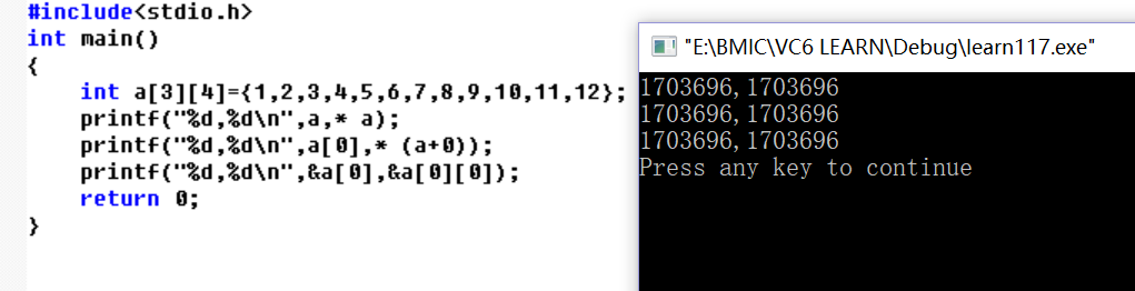 输出的第一行分别是0行起始地址和0行0列元素地址;第二行是0行0列元素地址;第三行分别是0行起始地址和0行0列的元素地址。
