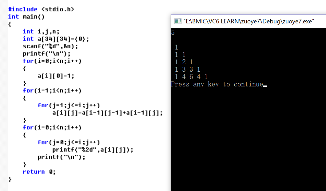 利用杨辉三角每位数字等于其上一行左上两位数字之和的性质。使用数组来做,先令其第一列的数字全部为1,for循环来算出每个数字的值并将其输出。