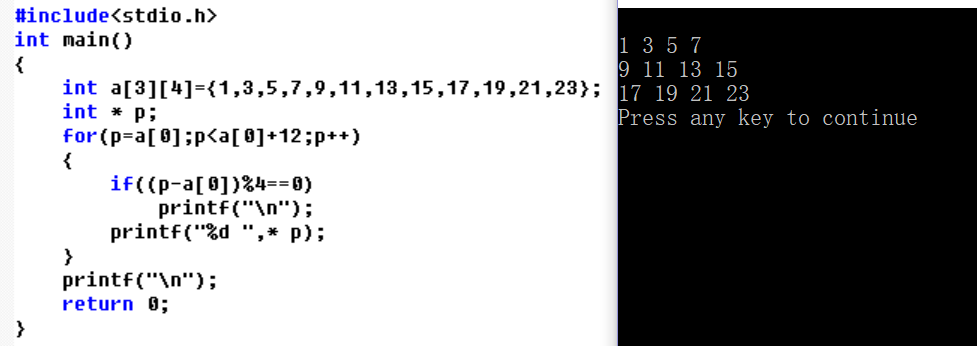 在for循环时将0行0列的值赋给指针p,if条件是指没输出四个数之后换行,printf输出时必须是* p是p指向元素的值。