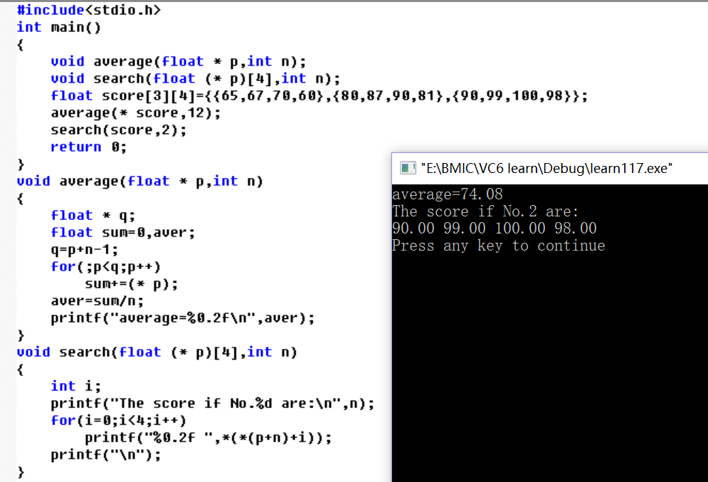 注意:在average函数中用到两个指针变量p依次指向每个元素,而q是最后一个元素。在函数search中(* p)[4]表示含有4个元素的一维数组,*(*(p+n)+i)则表第(p+n)行的第i列元素的值将其输出。