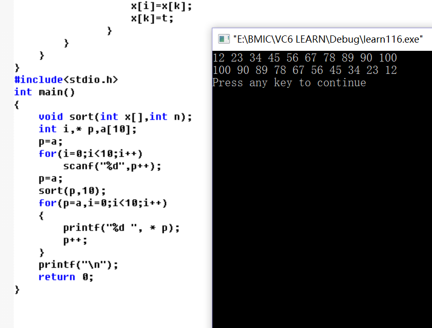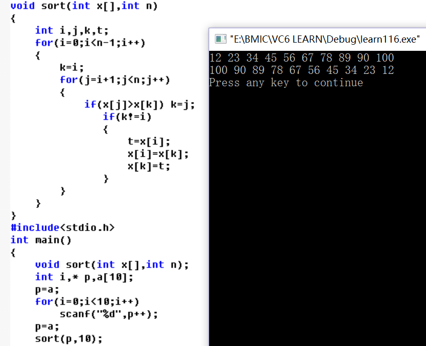 函数中x【】是形参数组名,在这个函数中i=0;j=i+1;i赋值给K,将k和j比较,若后者比前者大则互换位置,j++,与后面的数在比较,此循环结束后将i++接着比较。主函数中的输入和输出都用到指针。