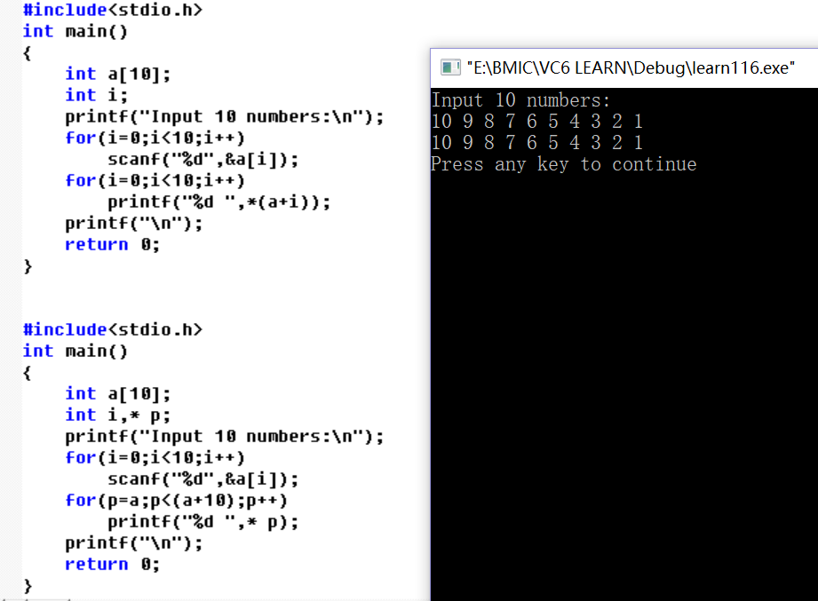 前面的程序是用常规发也就是下标法输入十个数字,而输出的时候是利用该元素的地址,*(a+i)是该元素的值。后面的程序输入的方法跟前者一样,但输出时是利用指针指向当前数组的元素来输出。