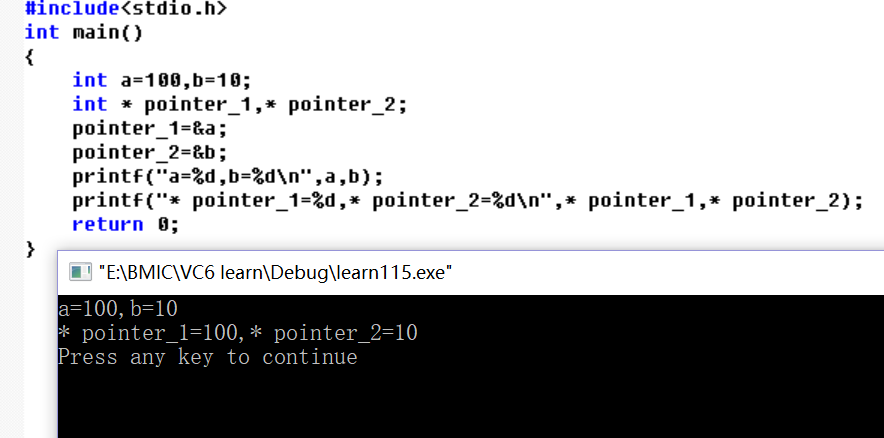 程序第五行的* pointer_1和* pointer_2表示定义两个指针变量pointer_1和pointer_2.‘*’只是表示该变量是指针变量。而第九行printf中的* pointer_1和* pointre_2则代表指针变量pointer_1和pointer_2所指向的变量。