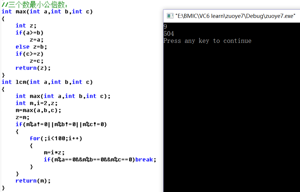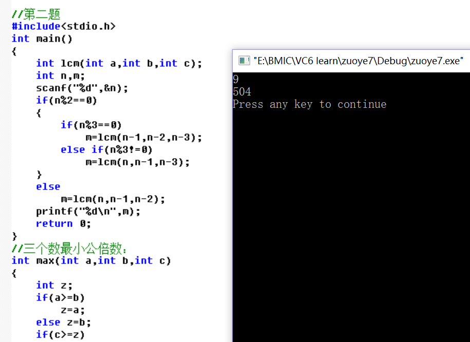 第二题大概思路:先写一个能求出三个数最小公倍数的函数(找出三个数的最大值的倍数依次除其他两位数若都能整除则该数为三个数的最小公倍数)。下面将分类讨论:①若N为奇数则n,n-1,n-2三个数的最小公倍数为最大的 ②若N为偶数,N能被3整除的情况下n-1,n-2,n-3三个数的最小公倍数为最大;N不能被3整除的情况下n,n-1,n-3三个数的最小公倍数为最大。