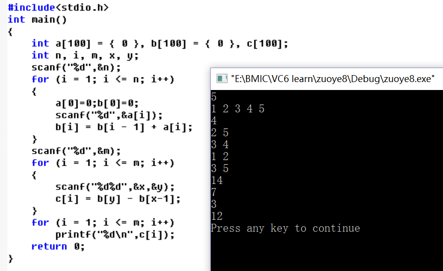 第二个for循环输入x,y,在a数组中从a[x]开始累加直到b[y],因为上面S总和中包含的有本身,所以应b[y]-b[x-1],b[x-1]表示x前面数字之和。差就为所求的区间数字之和。