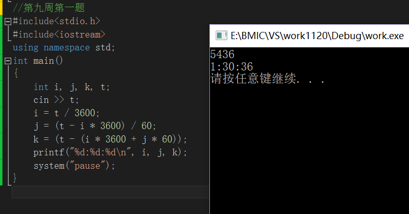 第一题利用公式计算出时,分,秒分别利用i,j,k存放,输出格式注意一下用:隔开。