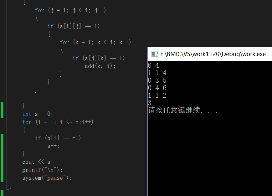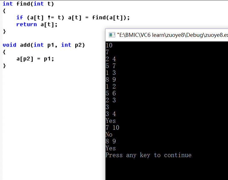 最后一个for循环查找,输入两个数判断是否为一个集合内,若是则表示有关系。