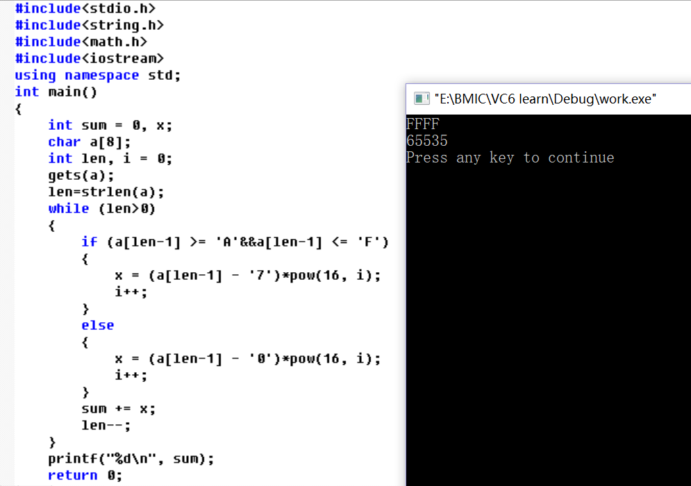 第二题利用数组存放字符串,可以用gets函数和strlen函数。strlen函数用来测量字符串的长度。A-F的ASCII码值是从65-70,若输入的为A-F则将其转化为10-15,可以用其ASCII码值减去“7”的ASCII 码数值刚好为10-15.若输入的是数字则ASCII码值范围是从48-57.令其减去“0”的ASCII码值得出0-9.再利用公式计算16次方。计算时倒序一次乘16的0次方,1次方···