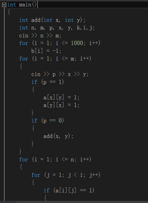 第三题用到并查集思想。思路:m条有关n个人的信息,p=1时为敌对关系,p=0时为同伙关系。在这m条信息中可以先做筛选:将同伙关系的聚集在一起放入一个集合内;因为这时每对敌对关系不确定其中的人是否与别人存在敌对关系可以合并,所以为敌对关系的先以每对的方式记录下来。(例:p,x,y=0 3 5则将3.5放入一个集合内{3,5},p,x,y=0 2 5则{2,3,5},p,x,y=1 1 4则记录下1-4位敌对关系)