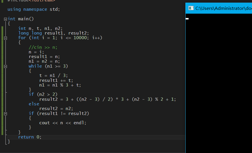 这道题我考试的时候是用的另一种方法来做的:先喝完手上所有的饮料,将能兑的盖子都对了,剩下的继续留在手上,兑完后再全喝掉,同样将能兑的对了喝掉,盖子留手上直到手上的盖子数量低于3个,统计喝了的瓶数。结果和题目给的例子相同,我就没仔细想了。星期六学长告诉了我们另一种思路,时间复杂度是1,而且逻辑方面更严谨一些。为了验证我的是否正确,我用所有n的可能取值比对了两个结果,发现结果都是相等的,都是对的。不过很显然,学长的方法时间复杂度更低,是更优的算法。