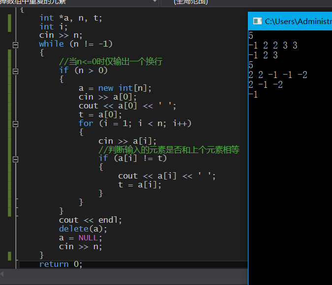 我运用一个t来代表前面的元素的数值。每次处理一个n个元素的数组,先创建一个大小为n的数组a,先输出第一个元素,输出这个元素,然后让t等于第一个元素,后面每次输入新数值就判断这个元素是否和t相等,如果相等就跳到下一次输入,不相等就输出这个元素,让t等于这个元素。释放掉这个数组,获取下一个数组的大小或者结束符号-1到n中,判断n是否为-1,若是-1,结束这个程序。