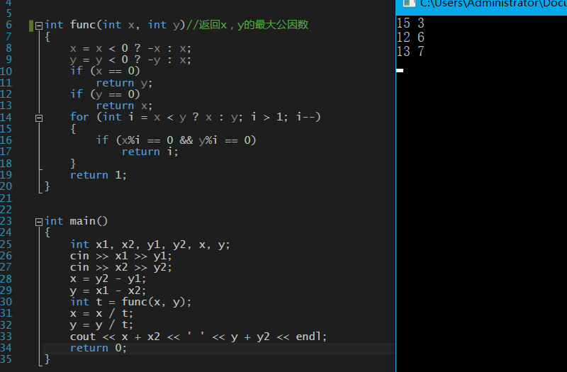 这个题目我是用开始的两个点来抽象出一个行动方向,然后角的关系,知道转向后,y方向为转向前x方向速度反方向(或者说是值的负数),x方向为转向前y方向速度的方向(或者说值相等)。然后再对转向后x,y的值除以x,y的最大公因数,再加上转向后的起点,即第二个点的值,就可以得到第三个点。