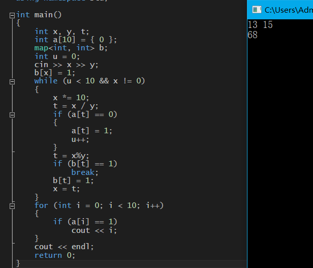 周一白天我试着完善了蓝桥杯校内赛小数点后出现数字的题目。这道题我在周日下午没有想出好的结束条件,只是设置了一个取余次数大于20000就结束的条件,这样说不定是有误差的。瞿学长给了我一个建议,添加一个判断余数是否在前面出现过的条件。我想这道题肯定不能直接用数组或链表来做,时间复杂度太大了。于是我打算直接用容器map来实现标记某个余数是否出现过。这样就可以做到万无一失了。