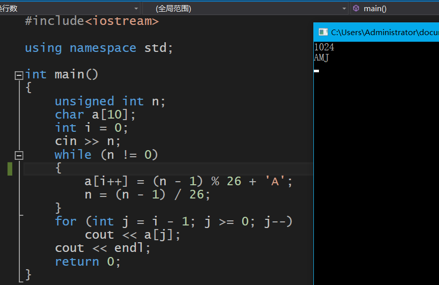 1024先-1再除以26得余数9,9加’A’得到第10个字母J,第二位是1023除26得39,第二位再减1除26余12,是第12个字母M,第三位同理,是A。